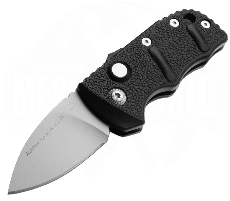 Klein mal ganz groß! Das AKS-74 Stubby Swiss Edition D2 ist ein praktisches Springmesser, welches ganz in der Tasche verschwindet und für alltägliche, kleinere Schneidaufgaben perfekt geeignet ist. Mit Griffschalen aus Aluminium in der typischen „AK-Optik“ überzeugt es sofort in puncto Aussehen und natürlich auch Handling. Die kompakte Klinge wird aus D2 Werkzeugstahl gefertigt, der für seine Zähigkeit und Robustheuit bekannt ist. Sie ist 4,8 cm lang und schießt sofort nach Betätigen des Druckknopfes auf. Durch einen Button-Lock-Mechanismus wird sie gehalten und kann zur Sicherheit über einen weiteren Lock arretiert werden. Die Stubby Swiss-Edition entspricht dem Schweizer Waffengesetz, da Springmesser im Land der guten Schokolade nur 12 cm Gesamtlänge haben dürfen, bei einer Klingenlänge von maximal 5 cm. Mittels Pocket-Clip kann der kleine Folder problemlos am Taschensaum befestigt werden. Und da es nur ca. 69 g wiegt, rutscht die Hose auch nicht in die Kniekehle.