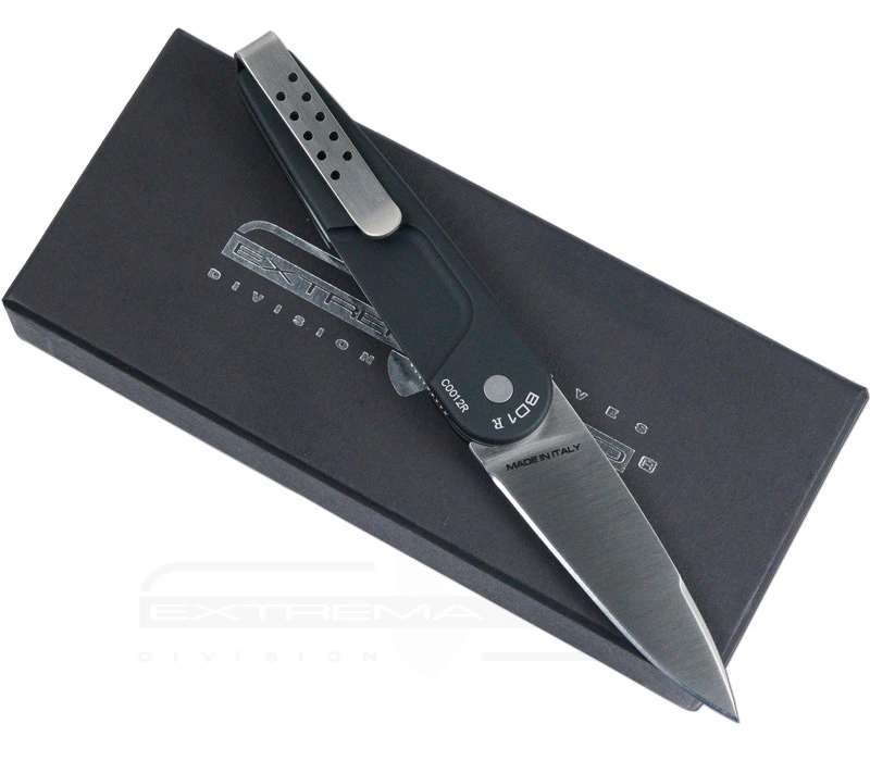 Dieses moderne Taschenmesser aus dem Hause Extrema Ratio verfĂŒgt ĂŒber eine satinierte Spear-Point-Klinge, welche aus auf 58 HRC gehĂ€rtetem Böhler N690-Stahl besteht. Trotz des schlanken Profils mit dem Fokus auf Leichtigkeit behĂ€lt es seine ZĂ€higkeit und ZuverlĂ€ssigkeit des italienischen Herstellers. In den Griff aus schwarz eloxiertem Aluminium eingefrĂ€ste Mulden gewĂ€hrleisten zusĂ€tzlichen Halt und machen das BD1 R zu einem echten Einsatzmesser. Die Klinge kann dank Razor-Tang-Extension komfortabel mit einer Hand geöffnet werden und ist somit mĂŒhelos einsatzbereit. Der robuste Liner-Lock arretiert die Klinge sicher. Durch den gelochten versetzbaren Deep-Carry Clip wurde das Gewicht des Messers auf ein Minimum reduziert. Mit seiner GesamtlĂ€nge von 170 mm und einem Gewicht von nur 75 g ist das Extrema Ratio BD1 R ein Leichtgewicht unter den Messern, was es zu einer idealen Wahl im Outdoor und Alltag macht.
