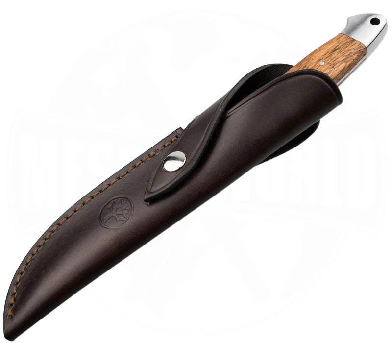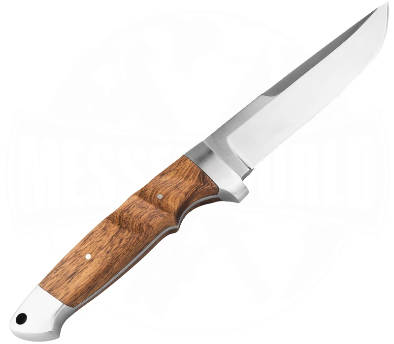 Das Böker Vollintegral XL ist ein hochwertiges feststehendes Messer, Made in Germany Solingen. Es besitzt eine beeindruckende Stabilität dank Vollintegralbauweise (Full-Tang). Die 5 mm starke Klinge mit Flachschliff besteht aus 440C-Stahl mit einer Rockwellhärte von 58-59 HRC und wird eisgehärtet. Mit einer Klingenlänge von 14,7 cm ist es für vielfältige harte Arbeiten und auch stärkeres Wild ausgelegt. Das aus einem Stück Stahl im Gesenk geschmiedete Messer ist mit aufwendig konturierten Griffschalen aus zertifiziert importiertem Palisanderholz versehen. Es bietet durch die Fingermulden sowie mit dem abgerundeten Handschutz und Knauf eine sichere Handlage beim Arbeiten. Wer es mag, kann am Knebel eine Fangschnur befestigen. Böker macht hier keine halben Sachen und liefert zum Messer eine ordentlichen Lederscheide mit Gürtelschlaufe.