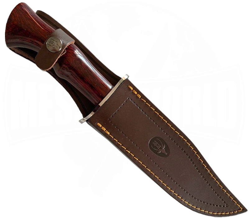 Das Bowie Pakkawood BW-18LR gehört zu den klassischen und traditionellere Modellen unter den Jagdmessern. Mit einem rustikalen Griff aus braunem Pakkaholz und einer 18 cm langen Klinge aus rostträgem MoVa-Stahl bietet es Profi einige Vorteile bei der Arbeit. Der durch seine Form auffällige Holzgriff, sorgt für ein angenehmes Handling, sodass auch auf lange Sicht ermüdungsfrei gearbeitet werden kann. Das Parierelement aus Edelstahl schützt die Hand beim Arbeiten mit dem Messer. Eine hochwertige Lederscheide wird als Tragesystem mitgeliefert.