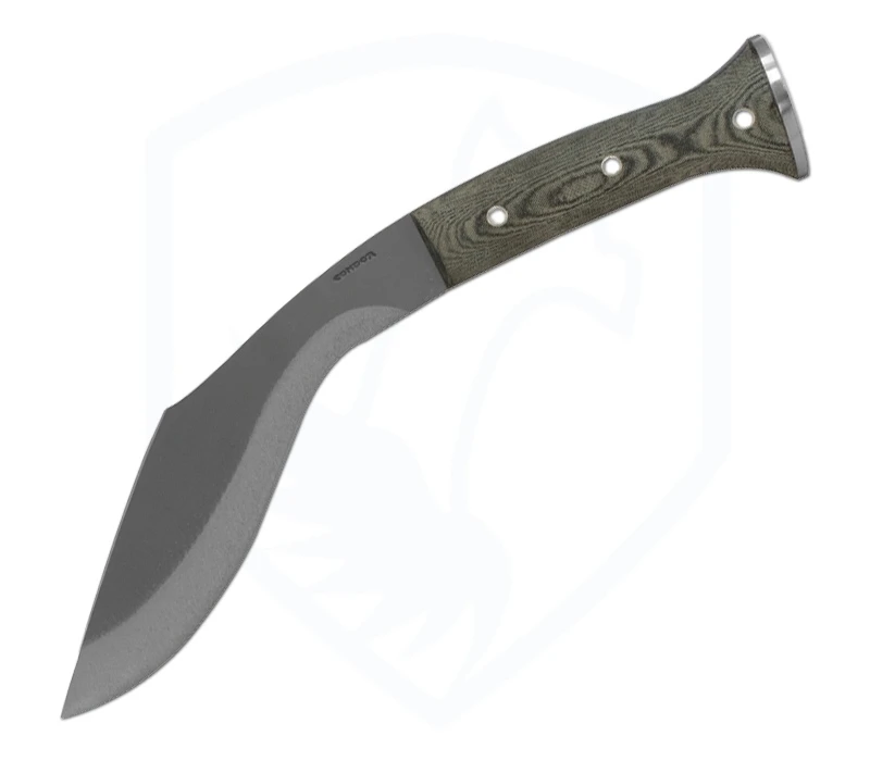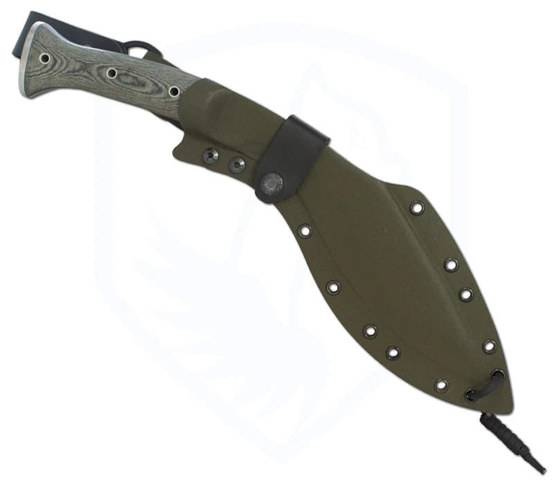 Condor ist bekannt durch seine robusten, arbeitstauglichen Macheten und Outdoormesser. Mit dem K-TAC Kukri Army Green Knife stellt Condor ein weiteres hochwertiges Outdoormesser bereit. Die für diese Messerart typisch gebogene Klinge hat eine Länge von 25,4 cm und ist aus nicht rostfreiem 1075HC High Carbon Stahl gefertigt. Dieser Stahl hat eine Rockwellhärte von 50-55 HRC. Dank 6 mm Klingenstärke ist das Kukri auch für den harten Einsatz im Outdoorbereich geeignet. Jede Klinge wird per Hand bearbeitet und auf Schärfe gebracht. Die Griffschalen sind aus grünem Micarta und dreifach vernietet. Dank des breiteren Knebels liegt das Messer sicher in der Hand. Was sich viele bereits gewünscht haben, ist jetzt in Erfüllung gegangen: Zum Transport des K-TAC Kukri dient eine moderne Kydexscheide mit Gürtelschlaufe und Kordel. Damit ist das Kukri-Messer sicher transportierbar.