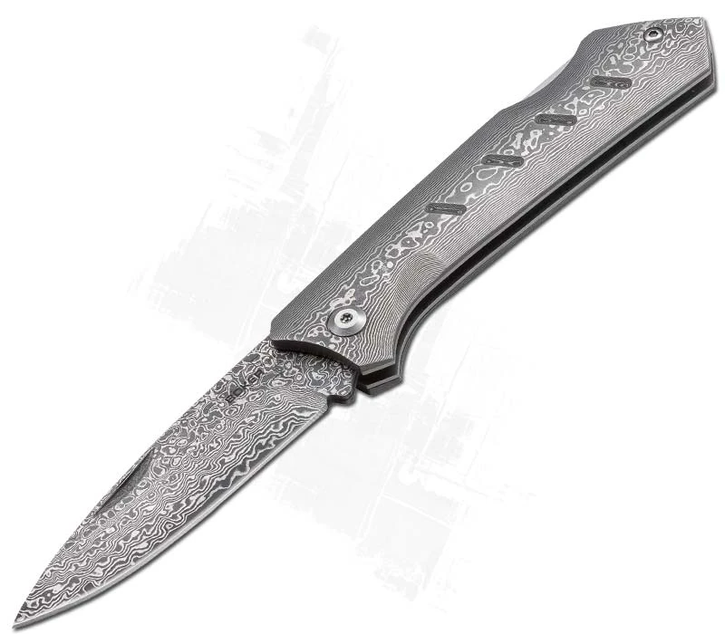 Das massive, aber dennoch elegante Damascus Dominator hat eine schön gezeichnete Klinge aus 37 Lagen Damaststahl. Auch die Griffbeschalung besteht bei diesem Modell aus Damast. Die angenehme Konturierung des Griffes bewirkt gleichzeitig einen außergewöhnlich harmonischen Verlauf der Maserung, die von kleinen Wellen am Rand der Schale in ein lebhaftes Zirkularmuster in der Griffmitte übergeht. Die Verriegelung der Klinge erfolgt über das Backlock. Das Messer wird zweihändig geöffnet und darf daher in Deutschland geführt werden.