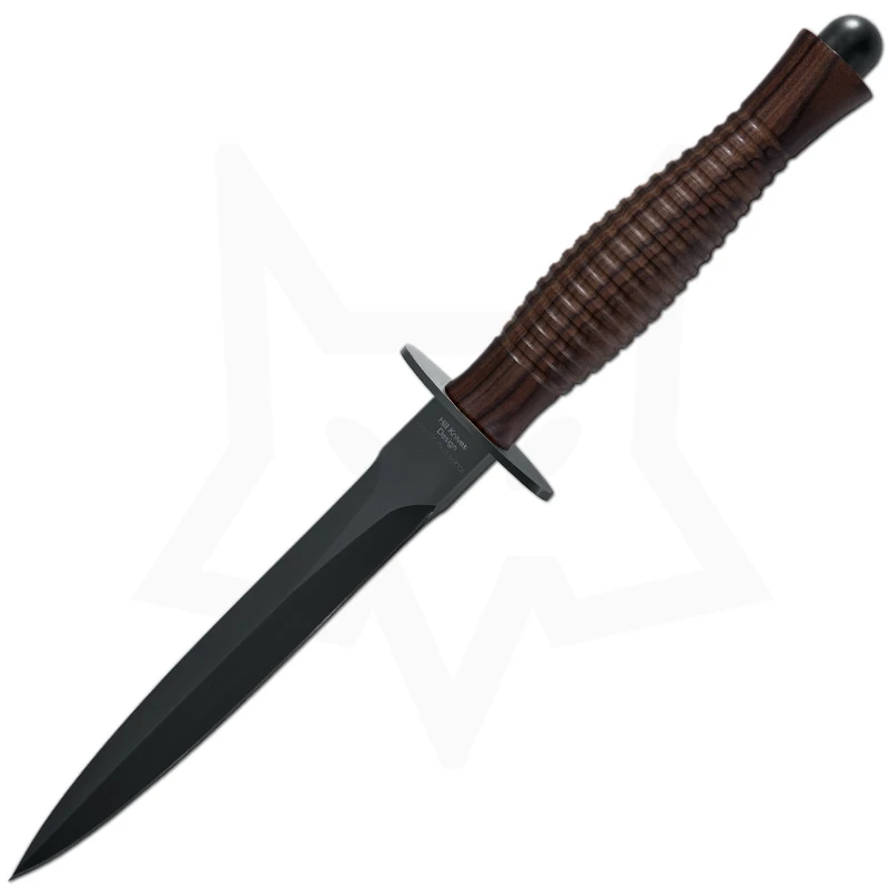 Sammler und Messserfreunde werden dieses Modell kennen: Der klassische britische Fairbairn / Sykes Dolch. Dieser wurde für Spezialeinheiten des britischen Militärs im Zweiten Weltkrieg entwickelt. Dieses Modell entwarf der holländische Messermacher Hill, der nur an wenigen Punkten das Design behutsam an die Neuzeit angepasst hat. Es ist ein wahrlich schöner Dolch, der auch Messersammler begeistern wird. Die Dolchklinge hat eine Länge von 17 cm und ist schwarz PVD-beschichtet. Der wirklich sehr schöne Griff ist aus Walnuss-Holz gefertigt und am Ende mit einem schwarzen Knebel versehen. Geliefert wird das Messer in einer klassischen Stecklederscheide.