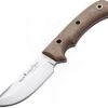 Das Gavilan von Muela ist eine wahre Augenweide. Die Backen aus Messing sind glÀnzend poliert. Sauber verarbeitet sind die Griffschalen aus Buchenholz, die eine verzierte Randstruktur aufweisen. Das Messer liegt dank Fingermulde sicher in der Hand. Als Klingenstahl wurde der spanische MoVa Stahl verwendet, der nicht nur schnitthaltig ist, sondern auch eine RockwellhÀrte von 57-61 HRC hat. Zum Transport dient eine robuste Lederscheide.