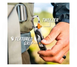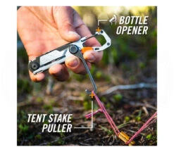 Das Stake Out erledigt die wichtigsten Aufgaben eines jeden Campers: die Pflege von Körper und AusrĂŒstung, das Kochen und das Auspacken. Es ist ein Ă€uĂerst innovatives Werkzeug, das fĂŒr den Campingplatz entwickelt wurde. Mit 11 Werkzeugen in einem. Klinge, SĂ€ge, Schere und die Ahle bieten eine Vielzahl an Schneidwerkzeugen. Der Zeltheringabzieher macht das Zusammenpacken des Zeltes zum Kinderspiel. ZusĂ€tzlich integriert sind noch ein Lineal, ein Flaschenöffner, eine Feile und eine Pinzette. Der stabile Karabiner ist in dem Rahmen eingebaut und kann an der Hose oder am Rucksack angebracht werden. Gewicht, Vielseitigkeit und Packbarkeit beeinflussen das Design des Stake Out und machen es zu einem unverzichtbaren Begleiter fĂŒr jede Reise
