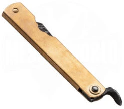 Ein Higonokami mit gefaltetem Griff aus Messing und einer 7,5 cm langen Klinge aus 7Cr13 mit einer schönen Schmiedehaut, mehr braucht das praktische Hoseki von dem Hersteller Higo nicht um zu überzeugen. Mit Hilfe eines Sporns lässt sich die Klinge in die gewünschte Position bringen. Am Griffende befindet sich eine Fangriemenöse, an der man ein schönes Lederband anbringen kann. Dieses Taschenmesser kommt ohne Verriegelung und ist somit in Deutschland ein legal zu führendes Messer. Wenn Ihr also was Leichtes, Schmales und Traditionelles sucht, dann habt Ihr es mit dem schicken Hoseki gefunden. Noch ein kleiner Tipp: Bei dem Preis könnt Ihr euch noch ein zweites gönnen, schaut einfach mal nach den anderen Higonokamis aus dem Hause Higo bei uns auf der Seite.