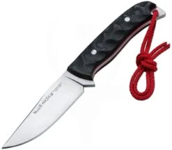 Das Husky von Muela hat eine flachgeschliffene Klinge aus dem hochwertigen, satinierten MOVA-Stahl. Der angenehme konturierte Griff ist aus griffig gefrĂ€stem Canvas Micarta gefertigt. Dadurch liegt das Messer sicher in der Hand. Die roten Fibereinlagen bilden einen sehr schönen Kontrast zum dunklen Griffmaterial. Geliefert wird dieses preisgĂŒnstige Outdoormesser mit einer schwarzen Lederscheide mit Druckknopfsicherung.