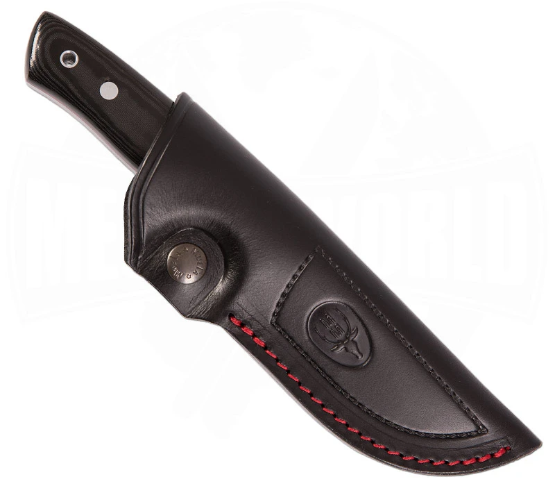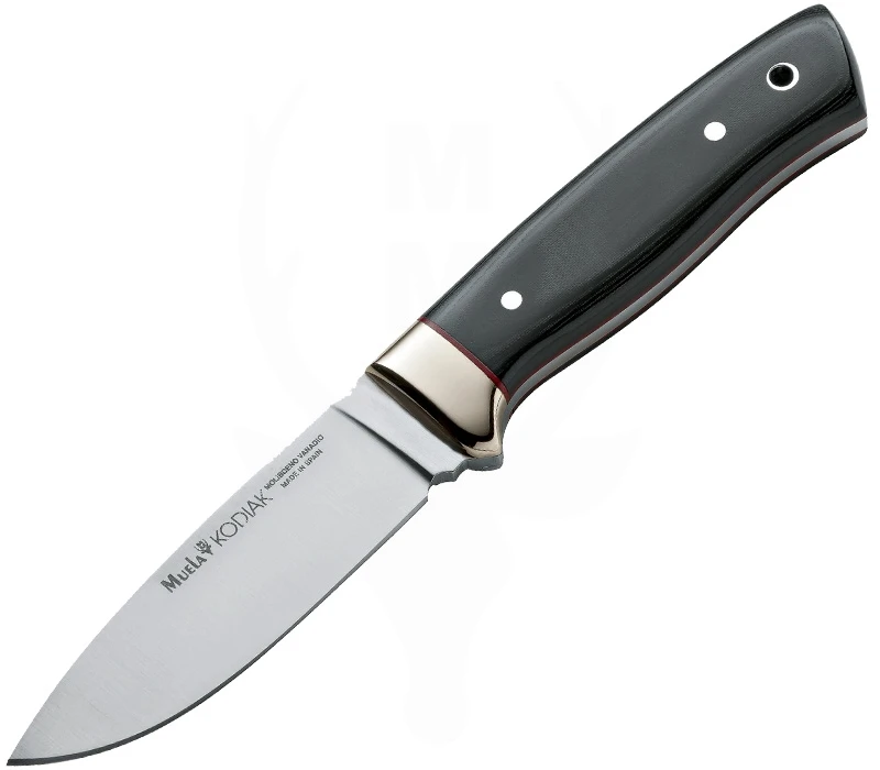 Das handliche Kodiak Messer ist in Vollerlbauweise hergestellt und hat schöne Griffschalen aus poliertem, schwarzem Micarta, die mit Pins befestigt sind. Am Griffende ist eine Ăse, an der ein Fangriemen angebracht werden kann. Die 11 cm lange Klinge besteht aus rostfreiem MOVA-Stahl, einem rostfreien MolybdĂ€n-Vanadium-Stahl mit einer RockwellhĂ€rte von 57-61 HRC. Zum Lieferumfang gehört eine stabile Lederscheide mit Druckknopf.