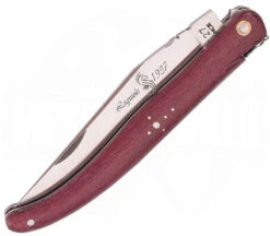 Das Arto Laguiole Amaranth kommt aus der französischen Messerhochburg Thiers. Das Slipjoint-Messer kommt mit einer Klinge aus rostfreiem Sandvik 12C27 Stahl. Mit der Clippoint Form schneidet es sauber und sehr präzise und eignet sich ideal für den täglichen Gebrauch. Der Griff aus Amaranth-Holz liegt sehr angenehm in der Hand und verspricht eine ausgezeichnete Handhabung. Das Hirtenkreuz in der Mitte des Griffes stellt das typische Merkmal der Laguiole-Messer dar und gibt dem Messer seinen französischen Charme. Hol dir dein eigenes traditionelles, französisches Messer und begeistere dich von dem Arto Laguiole Amaranth.