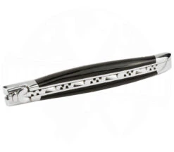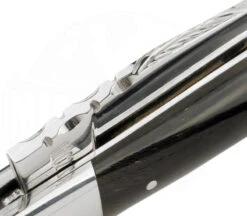 Dieses Laguiole Messer ist eines der beliebtesten Taschenmesser aus der Schmiede Laguiole en Aubrac. Handgefertigt und Made in Frankreich besitzt es fein polierte Büffelhornschalen, die mit den Platinen fest verbunden sind. Das Hirtenkreuz aus feinen Stiftnieten ist gut zu sehen. Die Rückenfeder ist auch etwas besonderes. Diese wird geschmiedet und dann händisch durch Feilarbeiten verziert (Zieselierung). Die herausgearbeitete Biene und die rückseitige Verzierung sowie die gesamte Herstellung dieses Messers übernimmt ein Messerschmied. Die 11 cm lange Schneide besitz eine feine Verzierung am Klingenrücken und wird zweihändig geöffnet und besteht aus rostfreiem 12C27 Sandvik-Stahl. Im geöffneten Zustand hat das Laguiole Messer eine Gesamtlänge von 22 cm und zeigt sein ganzes Profil und seine Schönheit mit den Edelstahlbacken. Es ist ein Messer, an dem kein Messer-Liebhaber vorbeikommt. Lieferung mit Echtheitszertifkat.