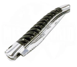 Ein exklusives Laguiole Messer aus der Manufaktur Laguiole en Aubrac wartet auf Sie. Es ist ein hochwertiges Gentleman-Messer. Mit bis zu 106 Arbeitsschritten wurde aus verarbeitetem Edelstahl und Ebenholz ein handgefertigtes Messer, das sich sehen lassen kann. Auffallend sind die Griffschalen, die aus gedrehtem hartem Ebenholz bestehen. Die Backen sowie die Klinge sind spiegelpoliert und passen optisch wunderbar zum dunklen Ebenholz. Für die Klinge wurde Sandvik-Stahl 12C27 gewählt. Dieser ist schnitthaltig und kann gut nachgeschärft werden. Zweihändig geöffnet, wird die spitze Klinge mit der starken Feder gehalten. Klinge und Feder sind von Hand guillochiert. Am Kopf befindet sich die geschmiedete Fliege, die bei diesem Modell mehr Verzierungen aufweist. Das Laguiole Messer Tourné verbindet das traditionelle Handwerk mit ganz speziellen neuen Ideen. Es ist also ein modernes französisches Taschenmesser, das nach traditionellen Überlieferungen gefertigt wurde.