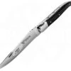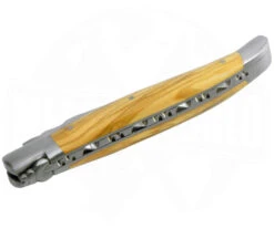 Ein handgefertigtes französisches Laguiole-Messer aus der Schmiede von Laguiole en Aubrac ist schon etwas besonderes. Auffallend sind die Griffschalen aus sehr schön gezeichnetem Olivenholz, die passgenau zwischen den matten Edelstahlbacken ein einzigartiges Farbspiel ergeben. Mit kleinen Edelstahl-Mikropins wurde das einseitig sichtbare Hirtenkreuz gefertigt. Die von Hand verzierte Feder (Ziselierung), die fast bis zum Griffende geht, und die geschmiedete Fliege machen das Laguiole Messer perfekt und erkennbar. Die Klinge aus modifiziertem 12C27 Stahl kann leicht zweihĂ€ndig geöffnet werden und wird durch die Feder gesichert (Slip-Joint Mechanismus). Die von Hand eingebrachte Verzierung ist nicht nur schick, sondern kann auch als Daumenauflage bestens genutzt werden. Ein Anschlag verhindert, dass die Klinge beim SchlieĂen mit der Schneide aufschlĂ€gt. Das handgefertigte Messer von Laguiole en Aubrac ist bestens fĂŒr den tĂ€glichen Einsatz geeignet und hat in jeder Hosentasche oder im Jackett Platz.