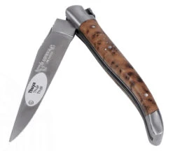 Ein handgefertigtes französisches Laguiole-Messer aus der Schmiede von Laguiole en Aubrac ist schon etwas besonderes. Auffallend sind die Griffschalen aus sehr schön gezeichnetem Olivenholz, die passgenau zwischen den matten Edelstahlbacken ein einzigartiges Farbspiel ergeben. Mit kleinen Edelstahl-Mikropins wurde das einseitig sichtbare Hirtenkreuz gefertigt. Die von Hand verzierte Feder (Ziselierung), die fast bis zum Griffende geht, und die geschmiedete Fliege machen das Laguiole Messer perfekt und erkennbar. Die Klinge aus modifiziertem 12C27 Stahl kann leicht zweihĂ€ndig geöffnet werden und wird durch die Feder gesichert (Slip-Joint Mechanismus). Die von Hand eingebrachte Verzierung ist nicht nur schick, sondern kann auch als Daumenauflage bestens genutzt werden. Ein Anschlag verhindert, dass die Klinge beim SchlieĂen mit der Schneide aufschlĂ€gt. Das handgefertigte Messer von Laguiole en Aubrac ist bestens fĂŒr den tĂ€glichen Einsatz geeignet und hat in jeder Hosentasche oder im Jackett Platz.