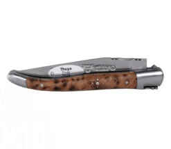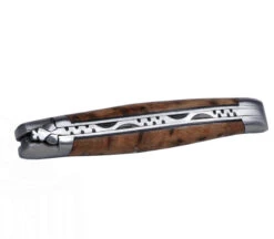 Laguiole en Aubrac zeigt mit diesem kompakten Laguiole-Messer mit einer GesamtlĂ€nge 18,5 cm ein schickes Taschenmesser fĂŒr den tĂ€glichen Gebrauch. Mit einer GrifflĂ€nge von 10 cm passt es in jede Tasche und wartet darauf, dass Sie es benutzen. Die Klinge mit einer LĂ€nge von 8,5 wird zweihĂ€ndig geöffnet und durch die verschmiedete Feder gesichert (Slip-Joint). Die Verzierung auf der Klingenoberseite kann optimal als Daumenauflage genutzt werden. Die sehr schönen Thujaholz-Griffschalen sind fest mit den Platinen vernietet und sitzen zwischen den mattierten Edelstahlbacken. Eine schöne Handarbeit sieht man bei der geschmiedeten Feder, die mit einem Muster versehen wurde. Ein Original aus dem Hause Laguiole en Aubrac, natĂŒrlich handgefertigt in Frankreich.Â
