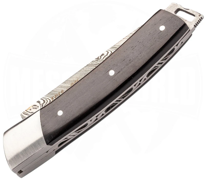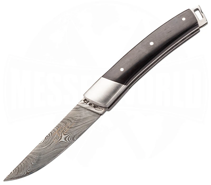 Ein Messer, welches nach seinesgleichen sucht! Das Fontenille Pataud Le Thiers Pocket Damast ist ein exquisites Sammlerstück, das jeden mit seiner schönen Optik und seiner hochwertigen Verarbeitung in den Bann zieht. Das in Frankreich, im Örtchen Thiers gefertigte Klappmesser besticht mit seiner 8 cm langen Klinge aus bezauberndem Damasteel im Muster Twist. Ganze 160 Lagen Stahl fasst diese schicke Klinge. Passend zum edlen Charakter des Messers, ist es mit Griffschalen aus Ebenholz besetzt. Abgeschlossen werden diese durch Edelstahlbacken am oberen Ende des Griffes. Das Le Thiers kann nicht arretiert werden und hält die Klinge lediglich über eine starke Rückenfeder aufrecht. Typisch für hochwertige französische Messer ist auch dieses Modell mit einem atemberaubenden File-Work versehen, also einer Verziehrung der Rückenfeder. Getragen kann das Messer mittels eines Fangriemens in der großräumigen Fangriemenöse werden.