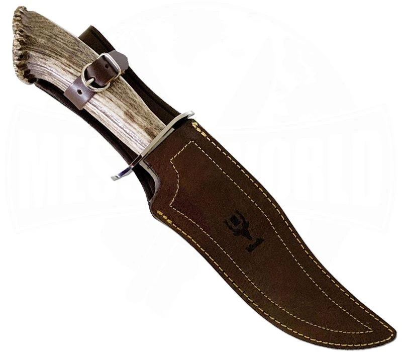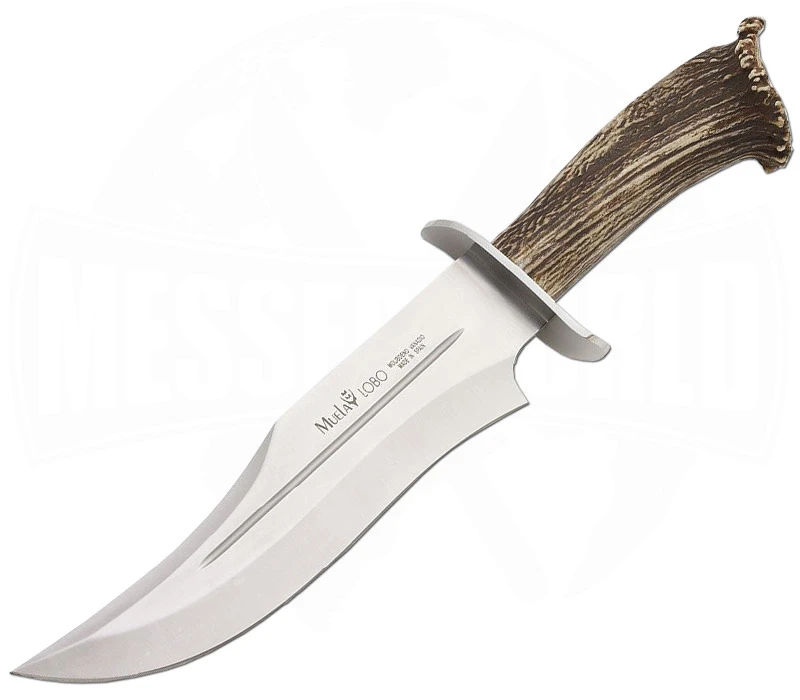 Das Muela Lobo Stag 23S ist ein wuchtiges Jagdmesser vom spanischen Traditionshersteller. Ausgestattet mit fein verarbeiteten Hirschhorngriffschalen kommt es mit einer ordentlichen Ladung Classic-Design. Nicht nur weist der Griff eine außergewöhnliche Form auf, auch die Jagdszenerie am Knaufelement macht optisch ordentlich was her. Die namensgebende Klinge mit einer Länge von 23 cm besteht aus Molybdän-Vanadiumstahl und bietet eine gute Rostbeständigkeit sowie eine solide Stabilität. Passend zum rustikalen Charakter des Messers wird eine braune Lederscheide mitgeliefert.
