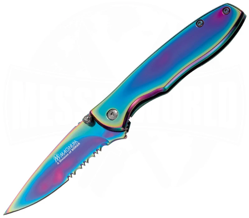 So schön wie ein Regenbogen ist das Magnum Rainbow II. Das Taschenmesser ist aus korrosionsbeständigem 440A gefertigt, mit einem Daumenpin als Öffnungshilfe. Verriegelt wird die 7,2 cm lange Klinge über den Frame-Lock. Der regenbogenfarbene PVD-beschichtete Stahl ist mit einem Wellenschliff versehen. Der elegante Edelstahlgriff besitzt einen Taschenclip, für eine sichere Aufbewahrung des Messers an der Hose. Mit einem Gewicht von 87 g und dem Clip ist das Messer für den schnellen Gebrauch gut geeignet. Das Rainbow II ist aufgrund seines Regenbogen-Designs ein echter Hingucker in der Messerwelt.