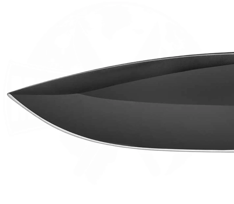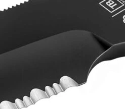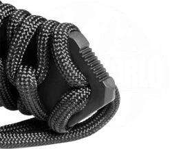 Schauen wir uns mal an, was dieses Messer so mit sich bringt. Ein Ganzstahlmesser mit einer Gesamtlänge von 24,6 cm, wovon 11,3 cm für die Harpoon-Klinge verwendet wurden. Der gewählte MOX-Stahl hat eine Härte von 58-59 HRC und wurde mit einer schwarzen Beschichtung versehen, die vor äußeren Einflüssen schützt und Kratzer sowie Licht- oder Sonnenreflexionen minimiert. Die Klinge besitzt einen Teilwellenschliff und am Griffende, der aus schwarzem 550er Paracord besteht, befindet sich ein Glasbrecher. Die Paracordschnurr am Griff lässt sich hervorragend für andere Aufgaben verwenden.