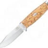 Bei diesem finnischen Sammlermesser werden nur edelste Materialien verwendet. Die Klinge ist aus 120 Lagen Damast mit einem außergewöhnliche Muster gefertigt. Der verzierte Knebel und der als stilisierter Vogelkopf gestaltete Griffabschluss sind aus Bronze gegossen. Der speziell wärmebehandelte Griff aus Maserbirke ist vor Feuchtigkeit geschützt. Eine schwarze Gürtelscheide mit Durchstechschutz gehört zum Lieferumfang. Das edle Messer wird in einer dekorativen Holzbox geliefert. Jedes Messer hat eine individuelle Seriennummer.