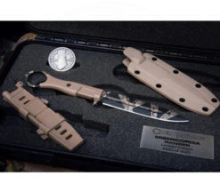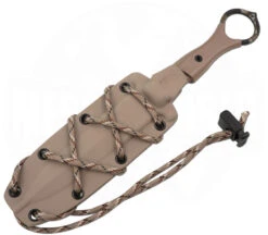 Und damit jedem Wunsch genüge getan wird, werden gleich zwei stylische Scheiden in Wüstentarnfarben mitgeliefert. Die erste aus Kydex kann mit einem Gürtelclip, Ulticlip oder Malice Clips befestigt werden. Auch das M.O.L.L.E.-System ist natürlich kein Problem, dank des Paracords. Die zweite Scheide, aus hochfestem Nylon, lässt sich mit den verstellbaren Schlaufen einfach und komfortabel am M.O.L.L.E.-System befestigen.