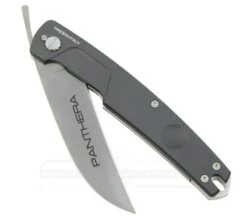 Das Panthera Messer von Extrema Ratio aus Italien treibt einem schon allein beim Hinschauen Schweissperlen auf die Stirn, und eine Stimme sagt: „Du willst es haben“! Abgeleitet vom Extrema Ratio T-RAZOR besitzt das Panthera eine 10 cm lange modifizierte Wharncliffe-Klinge, die nach vorne am RĂŒcken abgerundet wurde. Die OberflĂ€che der auffĂ€lligen Klinge ist satiniert. Mit dem Razor-Opening System wird die Klinge in Arbeitsposition gebracht und durch ein Liner-Lock arretiert. Der schwarz anodisierte Aluminiumgriff ist auch fĂŒr groĂe HĂ€nde geeignet. Am Griffende kann eine Lanyard angebracht werden, um das Messer aus der Tasche zu ziehen.