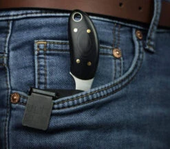 Das Pocket Knife ist ein feststehendes EDC-Messer mit dem unverkennbaren Stil von Mickey Yurco, das mit einer schlanken Art und minimalistischer Bauweise der ideale Begleiter im BĂŒro oder im Wald ist. Die 8,6 cm lange Klinge besteht aus dem gerne benutzten 440C Stahl und erleichtert mit seiner Drop-Point Form so einige Aufgaben im Alltag. Der genietete Griff besteht aus G10, das durch seine Robustheit sowie Griffigkeit perfekt fĂŒr so eine Art von Messer ist und liegt durch sein ungewöhnliche Form angenehm in der Hand. Die Hohlniete am Griffende kann zum Anbringen eines Lanyards oder Fangriemens verwendet werden. Bei der Kydexscheide plante der Designer, dass sie schrĂ€g in der Hosentasche Platz findet und das Pocket Knife so immer dezent getragen werden kann und stehts griffbereit ist.
