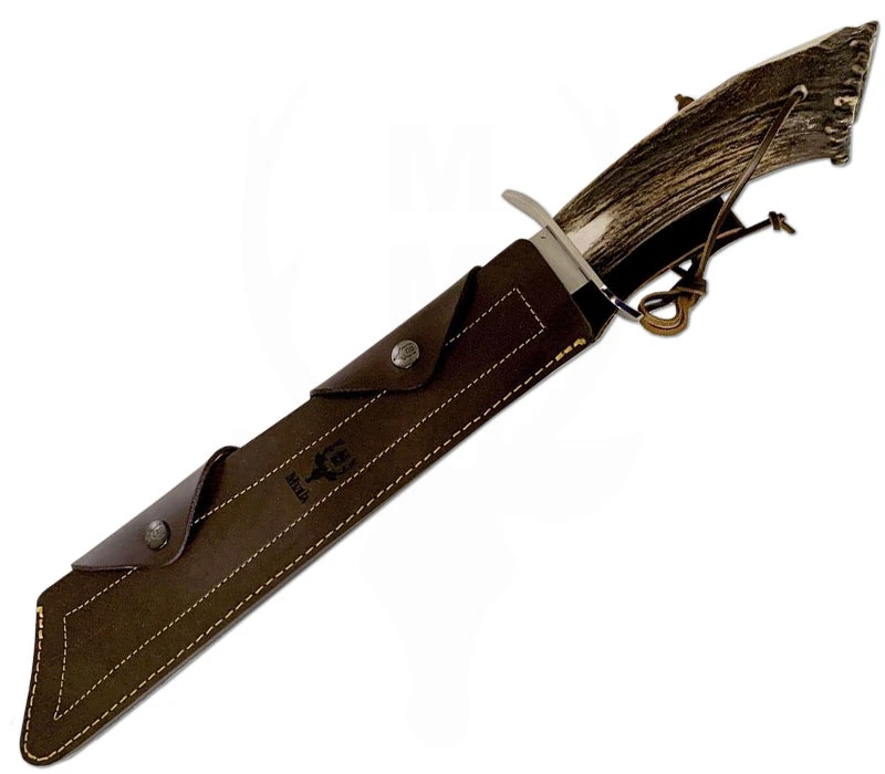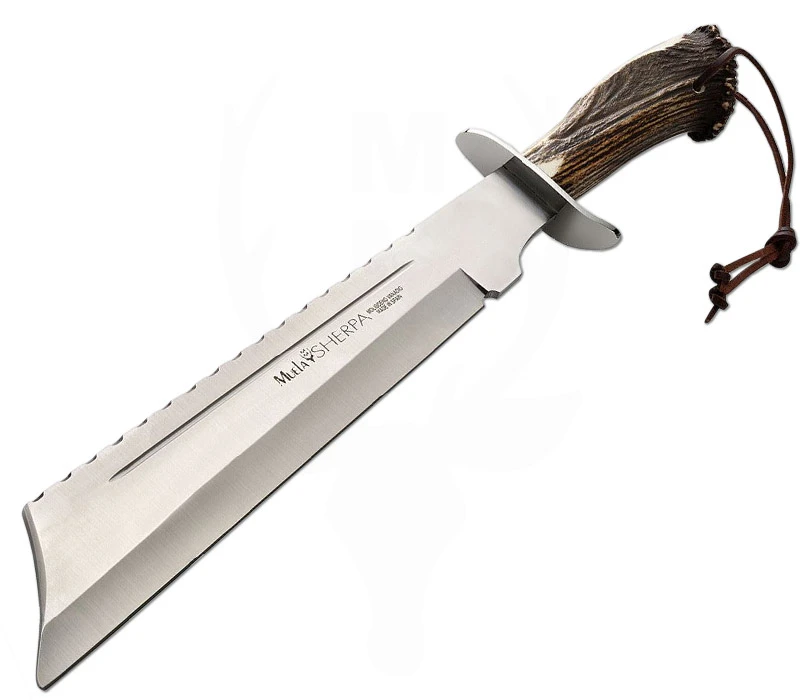 Muela ist ein legendĂ€rer Messerhersteller, der sich vor allem auf Jagd- und Sportmesser sowie Outdoormesser spezialisiert hat. Besonders beliebt sind die Messer mit feststehender Klinge und Griffschalen aus ausgesuchtem Hirschhorn. Das Sherpa ist sozusagen eine Machete im Muela-Hirschhornmesser Style, welches den Jagd-Charakter Muelas perfekt wiederspiegelt. Abgeschlossen werden die beeindruckenden Griffschalen durch ein Emblem, welches ene Jagdszene zeigt. Es begeistert Messer-Fans mit einer MoVa Stahl Klinge, die eine unglaubliche Klinge von 33 cm aufweist. Insgesamt ist die Machete 49 cm lang und somit schon ein ordentliches Exemplar! Trotz der gewaltigen GröĂe liegt es gut in der Hand und eignet sich durch die stabile KlingenstĂ€rke von 6 mm auch fĂŒr diverse OutdooraktivitĂ€ten. Eine hochwertige Scheide aus Sattelleder rundet das Gesamtbild ab.Â