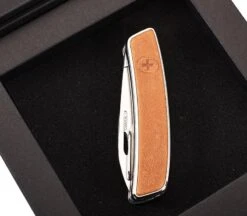 Wer das Besondere und AuĂergewöhnliche schĂ€tzt, wird von der Leather Collection von SWIZA begeistert sein. Die Ăsthetik der Formen und die Verarbeitung hochwertiger Materialien, die entscheidend dazu beitragen, ein Taschenmesser mit einer ganz eigenen Persönlichkeit zu erschaffen. Swiza ist das mit dem Leather Braun gelungen. Ein Messer mit einem revolutionĂ€ren durchdachten 360° Design, das ergonomisch optimal in der Hand liegt. Alle Werkzeuge sind leicht zugĂ€nglich und fĂŒr Links- und RechtshĂ€nder optimiert. Werkzeuge und Platinen sind aus hochwertigem 440/57HRC Stahl gefertigt. Wunderschön ist die kompakte Konstruktion der Griffschalen mit einer polierten Edelstahlumrahmung und hochwertigem, braunem Naturleder mit geprĂ€gtem Schweizer Kreuz. Handgefertigt und bravourös verarbeitet. Die scharfe, 7,5 cm lange Klinge besitzt eine Sicherheitsblockierung. Mit Druck auf das SWIZA-Kreuz lĂ€sst sich die Klinge entriegeln. Insgesamt 11 Funktionen bietet dieses hervorragende Taschenmesser. Das SWIZA Taschenmesser der Leather Collection ist ein besonderes Geschenk fĂŒr den Mann. Lieferung in einer schwarzen Geschenkbox.