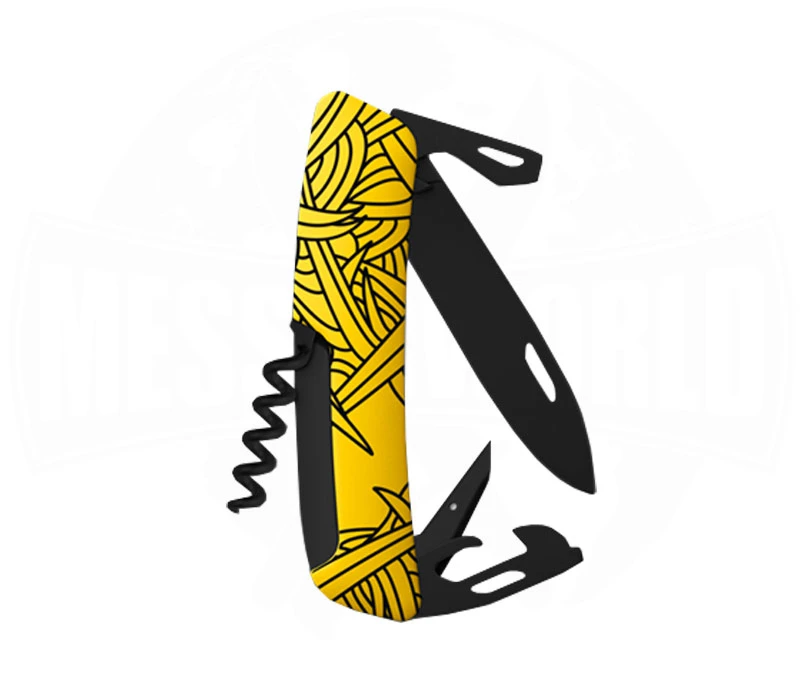 Dieses schicke Messer ist ein echter Blickfang und eine weitere kreative Idee aus dem Hause Swiza. Das D03 Pop Art 2 Allblack ist ein praktisches Multifunktionsmesser, welches mit nützlichen Tools wie Korkenzieher, Flaschenöffner, Pinzette, und einer Ahle daherkommt. Ein Dosenöffner rundet die Gesamtausstattung des EDC Messers ab. Im Comic-Pop-Art-Style angelegt überzeugen die Soft-Touch-Griffschalen in ihrer gelb/schwarzen Optik. Die Werkzeuge sowie auch die 7,5 cm lange Klinge sind schwarz beschichtet und lassen sich alle sehr leicht aus dem Heft heben. Ein Button-Lock sorgt für eine sichere und zuverlässige Arretierung.