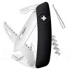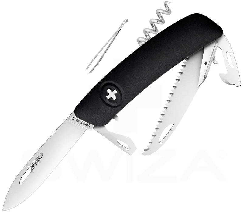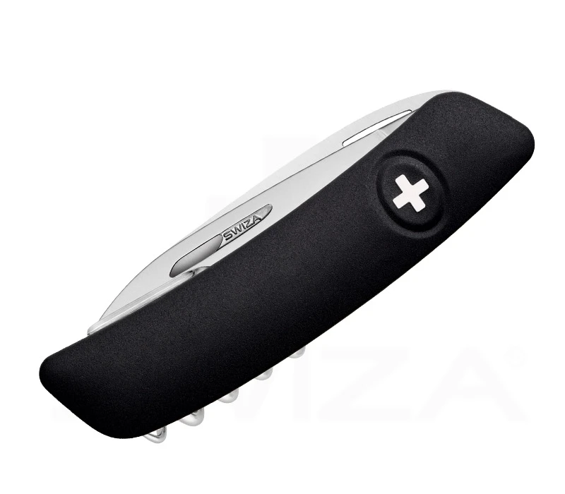 SIWZA Taschenmesser mit schwarzen Griffschalen. Die Modellreihe D05 besitzt hochwertige, gut zugÀngliche, funktionelle Werkzeuge. Dank des perfekten Griffdesigns und der Anti-Rutsch-OberflÀche der Griffbeschalung liegt das Messer angenehm und sicher in der Hand und ist einfach von Rechts- und LinkshÀndern zu bedienen. Durch die Sicherheitsblockierung der 7,5 cm langen, rostfreien Klinge aus hochwertigem 440 Stahl (57 HRC) ist ein sicheres Arbeiten gewÀhrleistet. Die Entriegelung erfolgt durch Druck auf das Swiza-Kreuz.