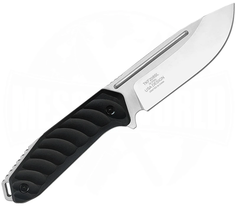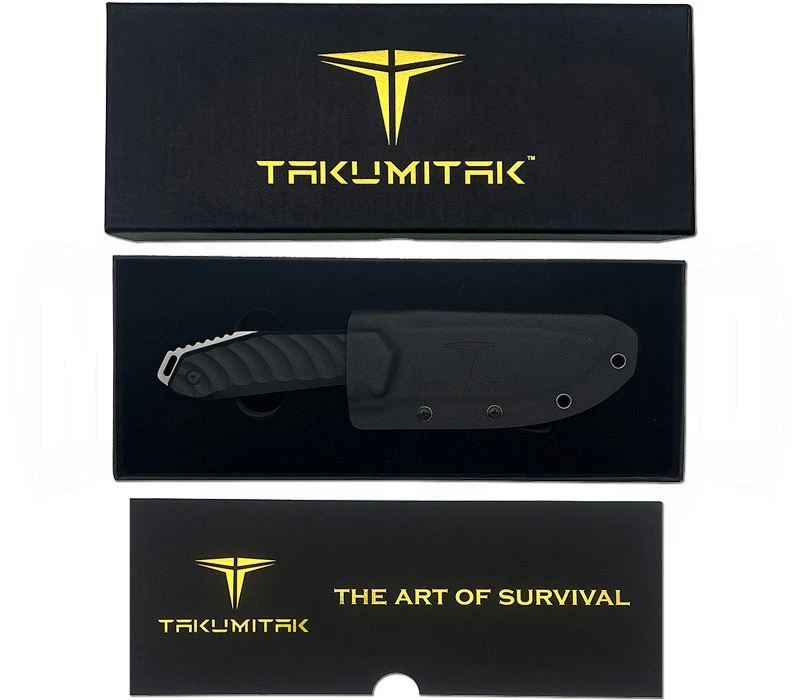 Das Takumitak Takumi ist ein praktisches und vielseitiges Outdoormesser. Seine D2 Drop-Point-Klinge ist auf 62 HRC gehĂ€rtet. Aufgrund des Gleichgewichts zwischen ZĂ€higkeit und HĂ€rte ist das Messer sehr zuverlĂ€ssig und eignet sich fĂŒr eine Vielzahl an Schneidaufgaben, von groben bis hin zu prĂ€zisen Schnitten. Die Vollerlbauweise lĂ€sst das Messer sehr stabil und stark wirken. Die Griffschalen aus schwarzem G10 besitzen starke Riffelungen, welche die Griffigkeit und die Arbeitssicherheit erhöhen. Das Takumi liegt sehr bequem in der Hand und verspricht eine tolle Handhabung. Am Griffende befindet sich ein Fangriemenöse, an der du deinem Messer ein Lanyard zum schnellen Ziehen anhĂ€ngen kannst. Die mitgelieferte Kydex-Scheide schĂŒtzt das Messer vor Schmutz und StöĂen, lĂ€sst das Messer immer in deiner NĂ€he und besitzt einen MOLLE-kompatiblen Clip. Das Takumitak Takumi ist ein vielseitiges Messer, das sich gut in jeder Messersammlung macht.