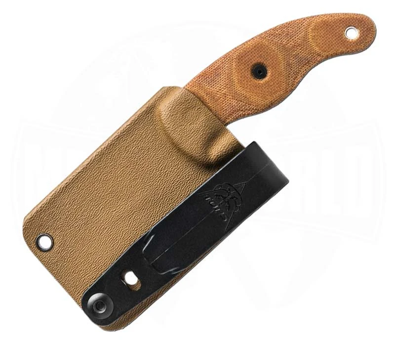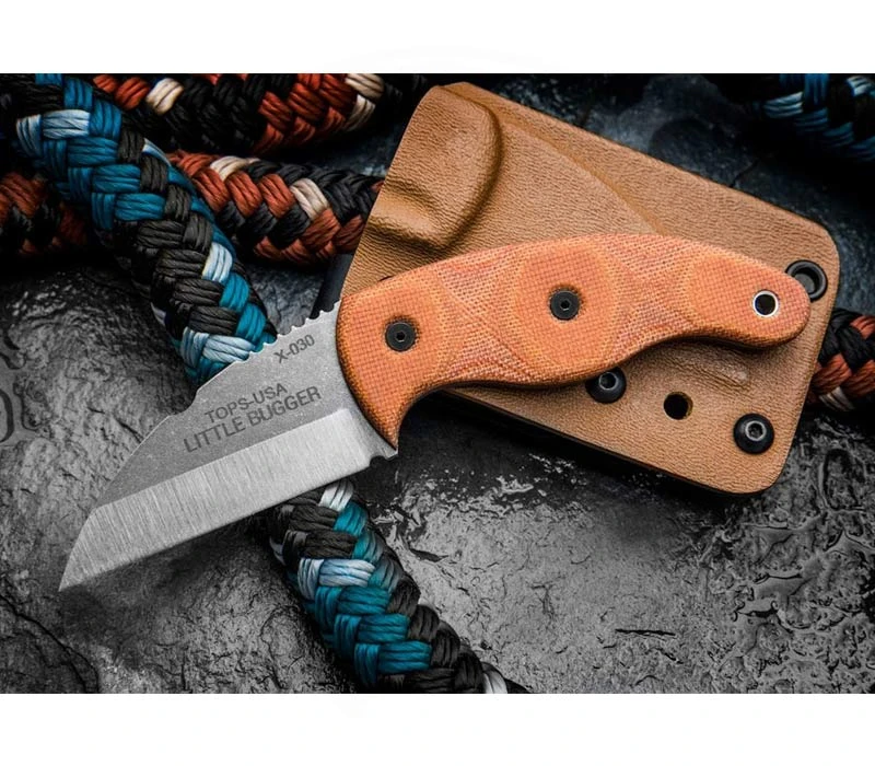 TOPS Knives Little Bugger wurde von Matt Graham entworfen. Der Athlet, Kampfkünstler und Experte für Jagd, primitive Waffen und Survival hat mehr „Dirt-Time“ als jeder andere da draußen. Deswegen ist das Messer auch ein echter Hit, denn wer weiß besser, wie man ein Messer entwickelt als er? Sein Ziel war es, ein Vollerlmesser zu entwickeln, das bei einem Ultramarathon nicht in einem Rucksack getragen werden muss. Die Wharncliffe-Klinge besteht aus 1095-Stahl und schneidet sehr gut ab. Der Erl ist mit dünnen braunen Micarta-Griffschalen umhüllt. Diese bieten eine hohe Griffigkeit, wodurch auch nasse Hände beim Benutzen kein Hindernis sind. Das Messer mit der Scheide wiegt gerade einmal 105 g und das Messer alleine 68 g. Die Scheide ist mit einem schmalen J-Clip an der Seite ausgerüstet, der sich ideal zum Tragen am Gürtel oder an einer Tasche eignet. Alles in allem ist das Tops Knives Little Bugger ein fantastisches Outdoor-Messer mit einem geringem Gewicht und einer hervorragenden Leistung.