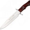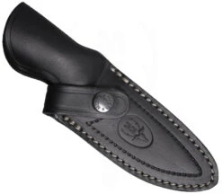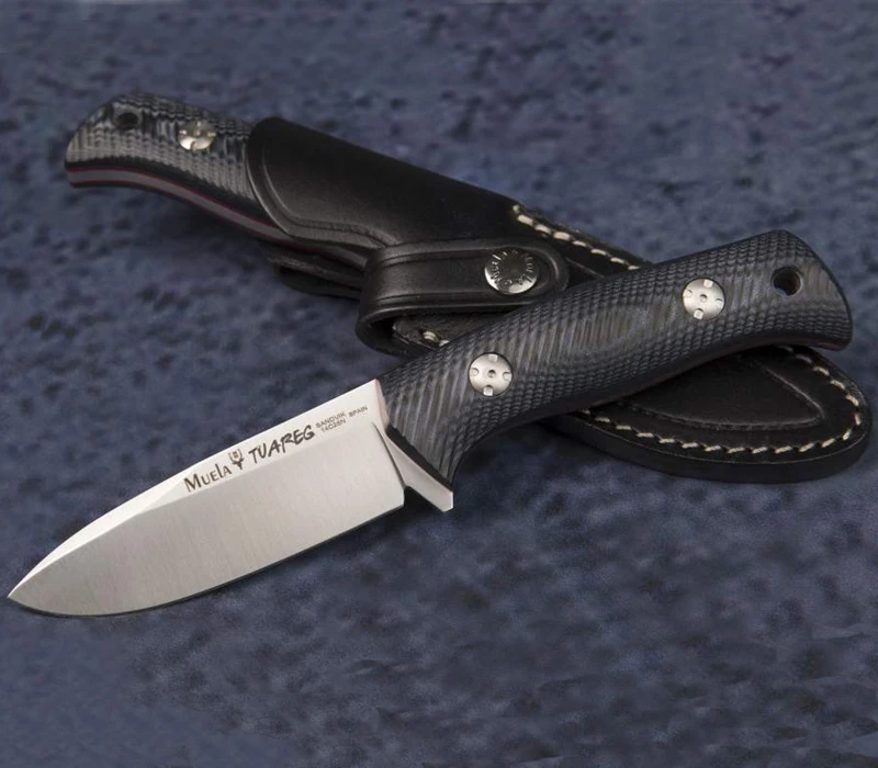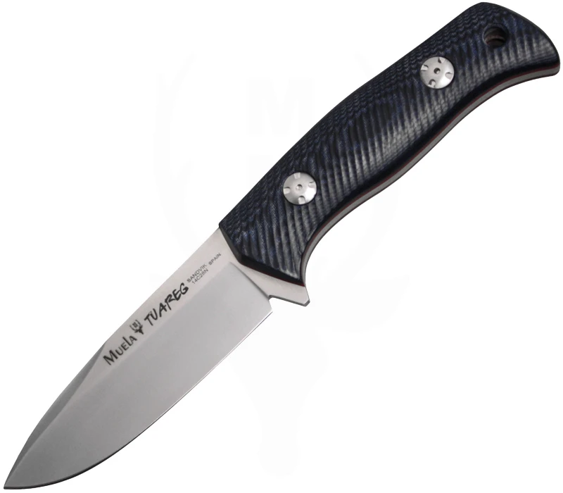 Die Tuareg sind eines der bekanntesten Völker der Sahara. Durch ihr geheimnisvolles Auftreten in ihren schwarzen Gewändern und mit ihren scharfen Klingen, reitend auf ihren Wüstenschiffen, brachten sie im 19. Jahrhundert in den Kolonialkriegen ihren Gegnern das Fürchten bei. Inspiriert von diesem stolzen Wüstenvolk bekam dieses robuste Outdoormesser von Muela seinen Namen. Ausgestattet mit einer hochwertigen, widerstandsfähigen, 10 cm langen und 4 mm starken Klinge aus 14C28N Sandvikstahl mit einer Rockwellhärte von 60 HRC ist dieses Messer bestens als Fahrtenmesser geeignet. Die zweifarbige Beschalung aus schwarzem Micarta ist mit einer roten Unterlage versehen und am Griff mit Zierschrauben befestigt. Dank des Handschutzes und der Ergonomie des Griffes liegt das Messer angenehm und sicher in der Hand. Am Ende des Griffes kann eine Fangschnur befestigt werden. Zum Transport des Tuareg wird eine sehr schöne schwarze Lederscheide mit Gürtelschlaufe mitgeliefert.