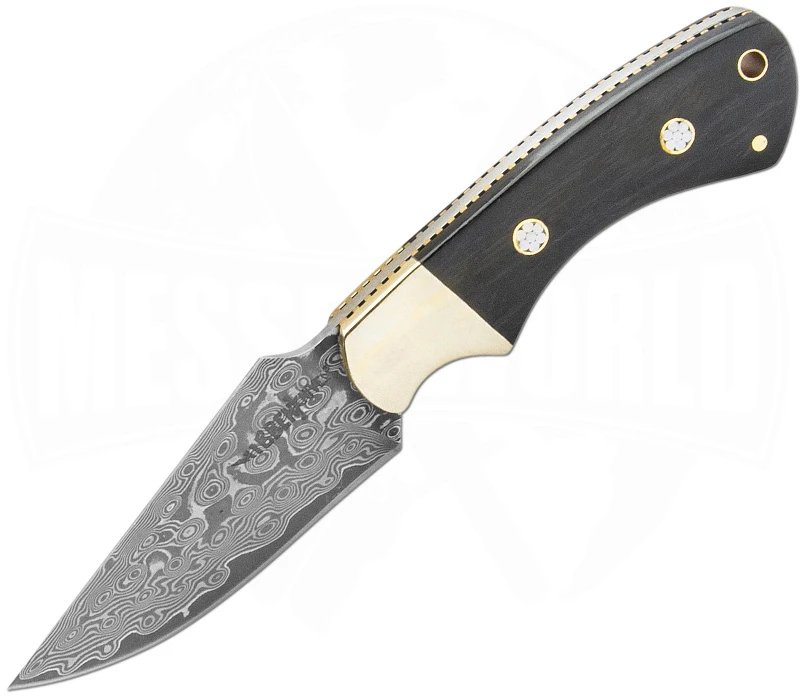 Das außergewöhnliche Messer in Vollerl-Bauweise wurde vom Designer Gil Hibben entwickelt. United Cutlerys Schneidwaren sind bekannt für ihre Extravaganz. So weist das Damascus Sidewinder Knife viele Auffälligkeiten im Design auf. Ein Beispiel dafür sind die auffälligen Akzente, wie Messingbacken, Ziernieten und die Fangriemenöse, welche dem Messer die Eleganz verleihen. Aufgrund der Vollerl-Bauweise ist es sehr stabil und belastbar. Ummantelt ist die Konstruktion mit einem aus Pakkaholz bestehenden Griff. Mit einem schönen Muster überzeugt die 8,9 cm lange Klinge schon auf den ersten Blick. Das Damascus Sidewinder Knife wird mit einer passgenauer Lederscheide geliefert.