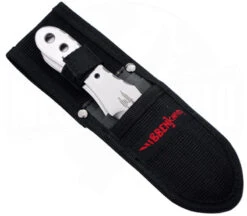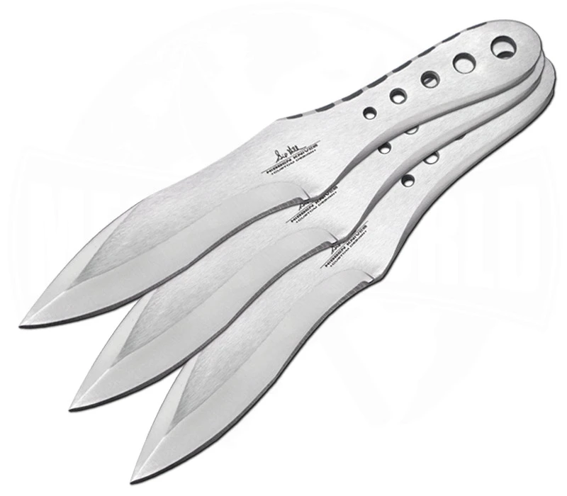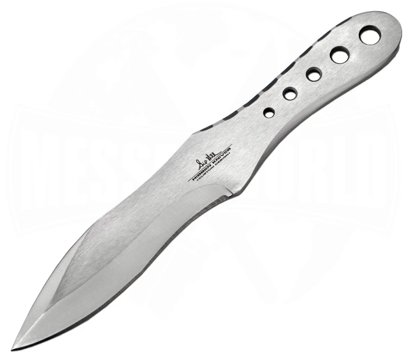Das Gil Hibben Gen-X Pro Wurfmesser-Set ist ein hochwertiges, dreiteiliges Wurfmesser-Set, welches mit einer sauberen Verarbeitung und markantem Design auf ganzer Linie überzeugt. Die modifizierte Recurve-Klinge besteht aus dem bruchsicheren und korrosionsfesten AUS-6 Stahl, wodurch er auch bei Fehlwürfen nicht gleich Ausbrüche bekommt. Der Griff dieses Ganzstahlmessers verzichtet, wie die meisten Wurfmesser, komplett auf Griffschalen und wurde für eine angenehme Haptik an den Kanten abgerundet. Die Bohrungen verringern das Gewicht im Griffbereich und verlagern somit den Schwerpunkt etwas in Richtung der Klinge. Mit im Lieferumfang enthalten ist neben den drei Messern auch eine hochwertige Nylonscheide, mit der die Wurfmesser transportiert werden können und beim Training immer griffbereit sind. Das von Gil Hibben entworfene Wurfmesser-Set eignet sich sowohl für Anfänger, die einen leichten Einstieg in das Hobby suchen, als auch für erfahrenere Anwender.
