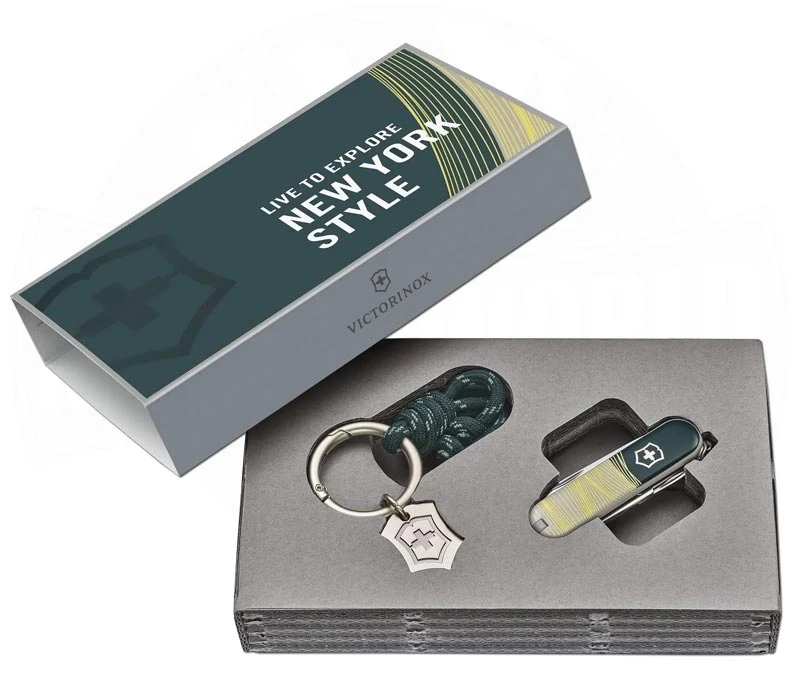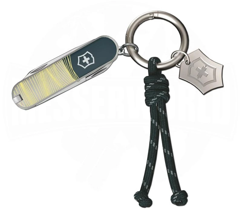 Aber was genau hat dieser praktische Helfer zu bieten? Die Griffschalen aus ABS/Cellidor wurden mit einer Farbkombination aus schwarz, gelb und Silber versehen, was ihm einen sehr modernen Look verleiht und die Stadt, die niemals schläft, widerspiegelt. Hinter den Griffschalen verstecken sich Schere, Nagelfeile, Schlitzschraubendreher, Klinge, Zahnstocher und Pinzette. Auch finden wir einen Schlüsselring mit einem Paracord und einem Anhänger, auf dem das Victorinox Embleme zu sehen ist. Öffnen lassen sich die Tools über einen Nagelhau.