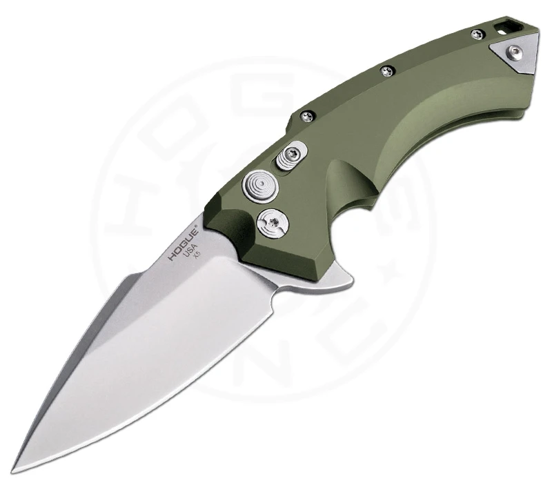 Das Hogue X5 3.5 OD Green hat ein auffallendes Design. Die 8,9 cm lange Drop-Point-Klinge ist mittels Flipper leicht und schnell zu öffnen. Durch das bewährte Hogue Schließsystem mit Druckknopf und Sicherungsschieber ist ein sicheres Arbeiten gewährleistet. Die extrem robuste Klinge ist aus pulvermetallurgischem CPM-154 Hochleistungsstahl gefertigt. Die X5 Reihe von Hogue beeindruckt mal wieder mit überaus hoher praktischer Einsatzfähigkeit und besten taktischen Einsatzmöglichkeiten. Durch die futuristische Formgebung des Aluminiumgriffes aus Flugzeugaluminium 6061-T6 ist jedes Modell der Serie ein Hingucker und liegt ergonomisch und griffsicher in der Hand. Mit umsetzbarem Deep-Carry-Clip und Fangriemenöse.